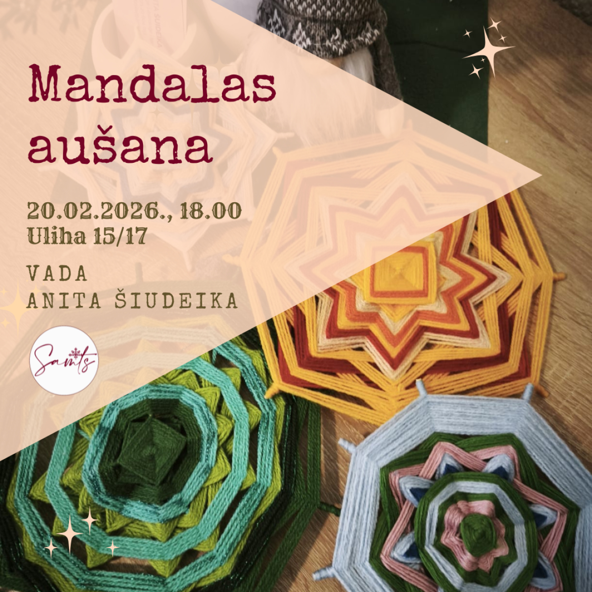 Nodarbībā dalībniekiem būs iespēja iepazīt madalu veidošana tradīciju un simbolisko nozīmi, kā arī praktiski praktiski apgūt mandalas aušanas tehniku, izmantojot dziju un koka spieķīšus. Radfošajā procesā dalībnieki soli pa solim izveidos savu unikālo mandalu, attīstot pacietību un radošo domāšanu.